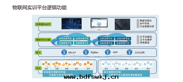 終(zhōng)端节(jié)点包(bāo)括两(liǎng)大(dà)類(lèi) —類(lèi)是(shì)用(yòng)千(qiān)某个(gè)场(chǎng)景下(xià)的(de)實(shí)際應(yìng)用(yòng)展(zhǎn)示, 为(wèi)云計(jì)算和 APP 提(tí)供标(biāo)準的(de)數據(jù)參考,另(lìng)—類(lèi)是(shì)用(yòng)于(yú)學(xué)生(shēng)實(shí)際操作,讓學(xué)生(shēng)开發(fà)和物(wù)联网(wǎng)調試。